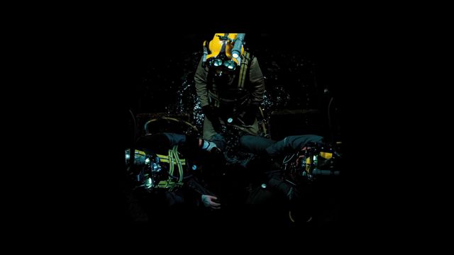 そして潜水する3人は不自由な潜水服に身を包み、3人を結び、いざ沈没船の方向へ。