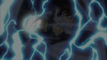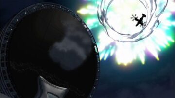 コナンは見えた!と言い、ボール射出ベルトからボールを出し、キック力増強シューズでボールを蹴り、勢いよく蹴りだされたボールは航空機にぶつかり、そのまま天空へ。