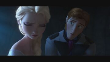お互いを求めて歩き出す二人だが、アナがふと目を外にやると、そこにはエルサの姿と、今にもエルサに斬りかかろうとするハンス王子の姿が。