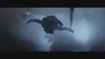 そして軍用飛行機にてはるか雲の上からパラシュートでゴジラとムートーが戦うすぐ側に着地。