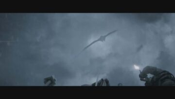 墜落する戦闘機に慌てる隊員の上空からムートー オスが。