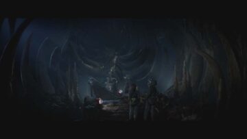 話を聞きながら炭鉱の奥を進むと、そこには見たことの無い巨大な生物の化石と、二つの卵が。