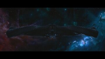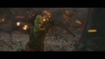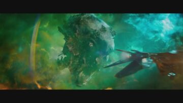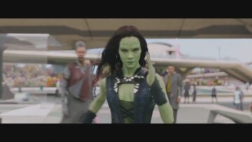 宇宙空間に残されたガモーラは、宇宙空間では長い間肉体を維持できないと、ロケットはガモーラの命を諦め、去って行く。