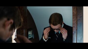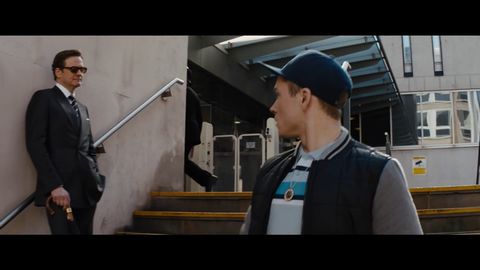道中で、キングスマンの身だしなみとして髪型もきっちり、スーツに着替えるエグジー。