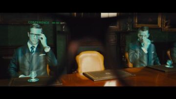 ハリーが机に座り、眼鏡をかけると、ホログラフィックで複数のエージェントが現れ、そのままネット会議。