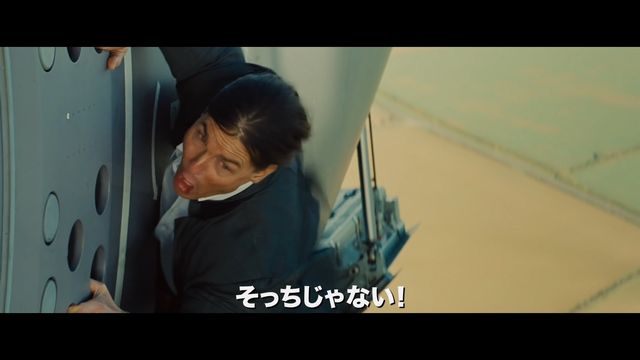 この映画の予告やCMで代表的にとられている上空1500mで飛行機にしがみつくシーン。