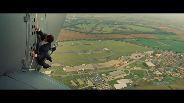 そして今作では、ヨーロッパの軍用輸送機エアバスA400Mの機体にしがみついたまま、上空1500mまで上昇する中、演技を行うという超絶スタントを実行。
