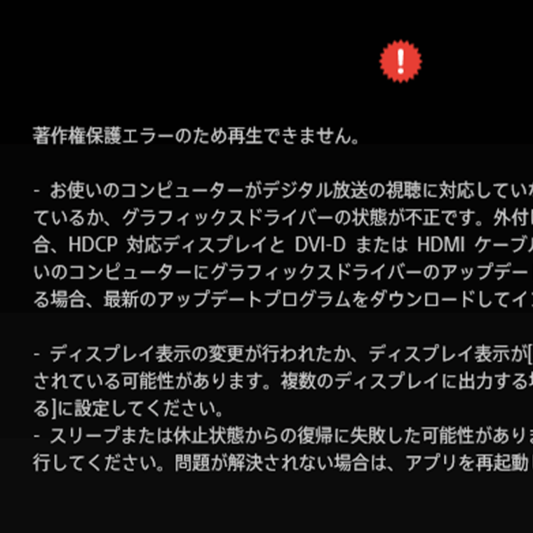 -スリープまたは休止状態からの復帰後に本エラーが発生している場合は、コンピューターのグラフィックデバイスに互換問題があります。前の画面に戻り再試行、またはアプリを再起動してください。問題が解決されない場合は、コンピューターを再起動してください。](https://yurui.blog/wp-content/uploads/2019/03/pctvplus-hdcp-error_15-360x360.png)