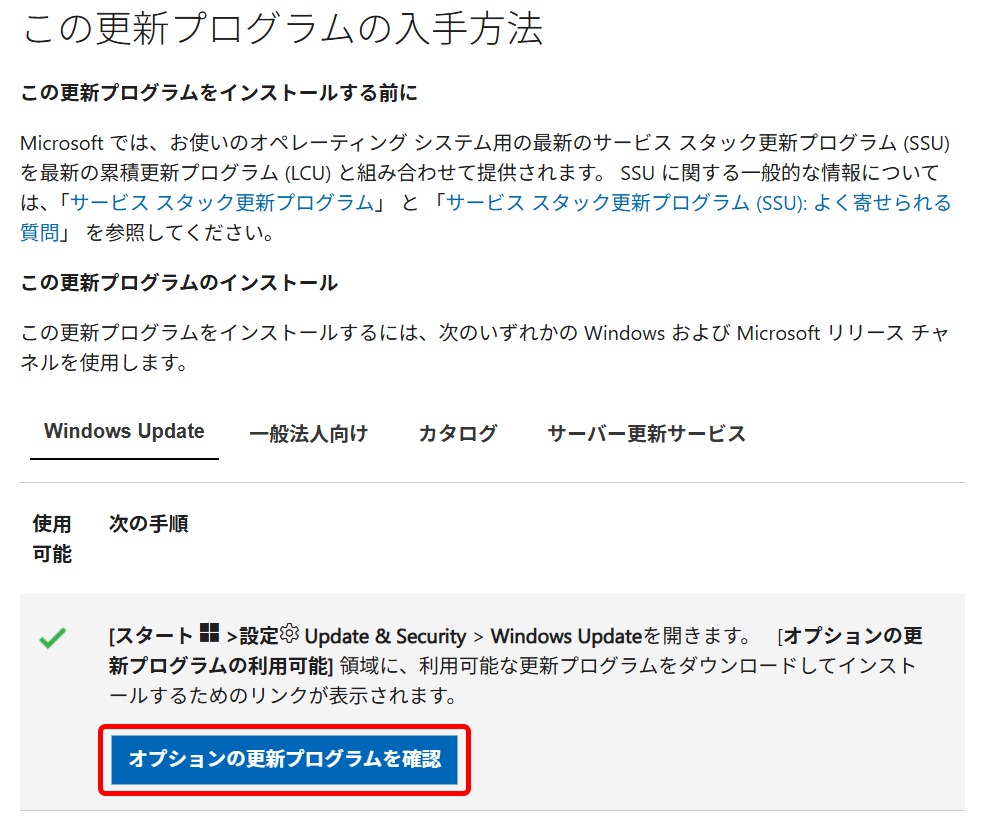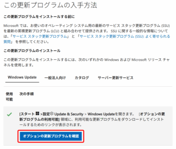 「この更新プログラムの入手方法」という所までページをスクロールして、「オプション更新プログラムを確認」の青いボタンをクリックします。
