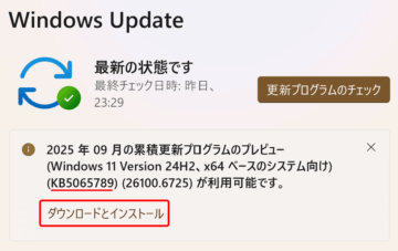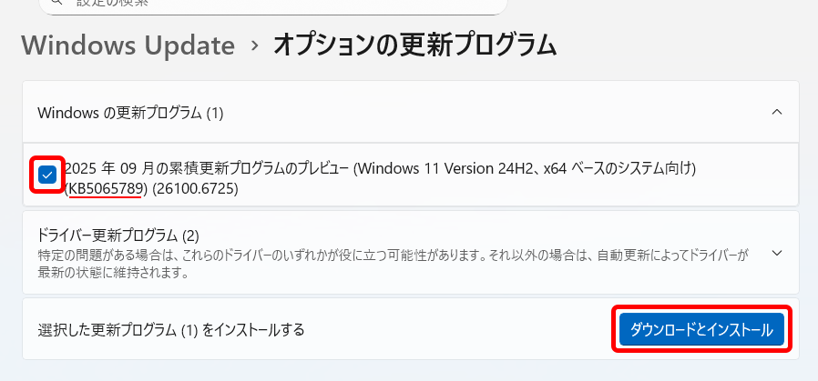 設定ウインドウが開かれるので、「KB5065789」の項目にチェックをつけて、「ダウンロードとインストール」ボタンを押します。