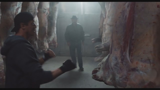 この映画でも、ファンを喜ばせるためか、生卵を一気飲みするシーンや、冷凍庫に吊された食用の牛をサンドバッグ代わりにしようとする、まさにロッキーなシーンがジョークとして盛り込まれていました。
